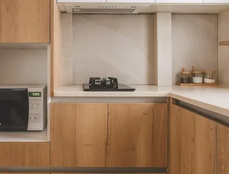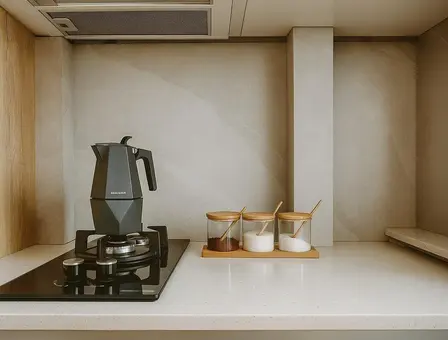 - Modern equipped kitchen with dishes, microwave, gas stove, electric kettle, toaster, geyser coffee maker, water filter and necessary accessories, tea, coffee, sugar